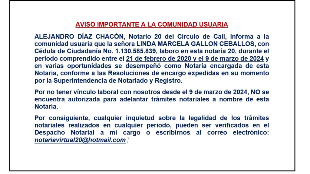 ALEJANDRO DÍAZ CHACÓN, Notario 20 del Círculo de Cali, informa a la comunidad usuaria que la señora LINDA MARCELA GALLON CEBALLOS, con Cédula de Ciudadanía No. 1.130.585.839, laboro en esta notaría 20, durante el periodo comprendido entre el 21 de febrero de 2020 y el 9 de marzo de 2024 y en varias oportunidades se desempeñó como Notaría encargada de esta Notaria, conforme a las Resoluciones de encargo expedidas en su momento por la Superintendencia de Notariado y Registro.